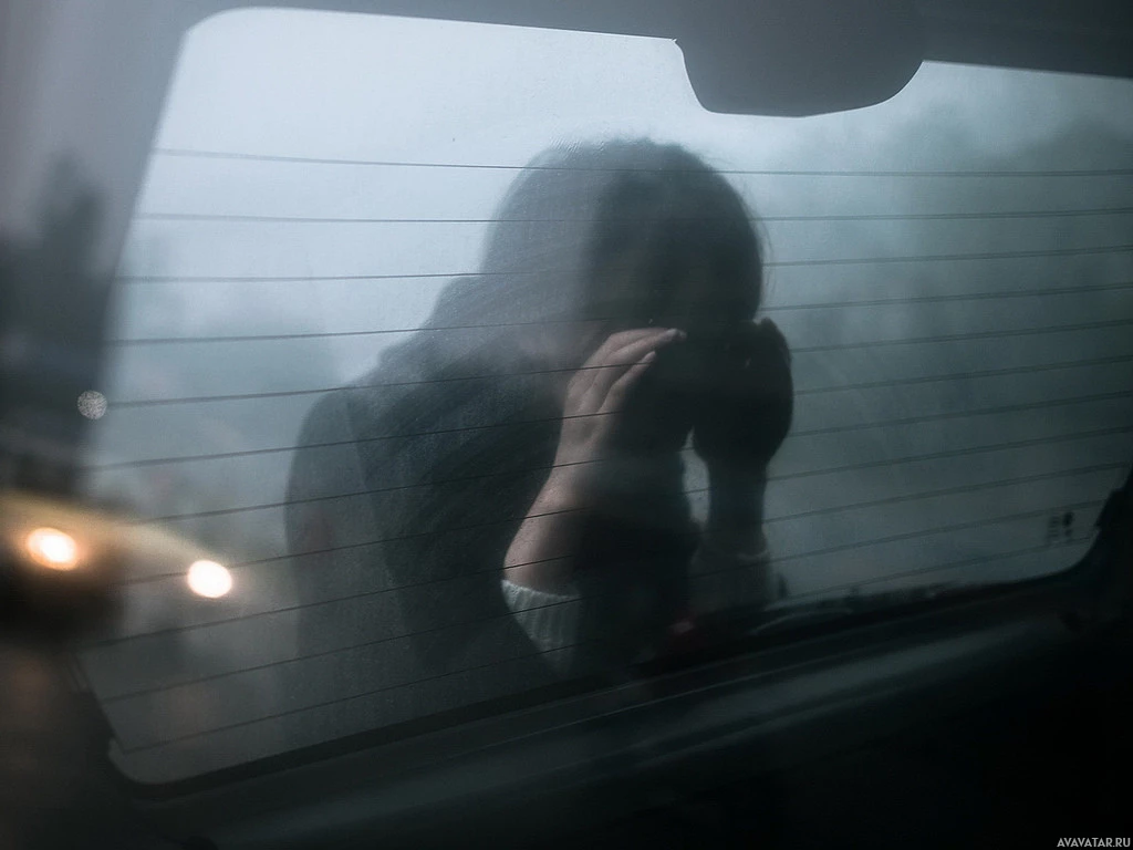 На снимке изображен силуэт девушки внутри автомобиля, выглядывающей через мокрое и туманное окно. Дождь кажется довольно сильным, о чем свидетельствуют полосы на стекле. Внутреннее освещение внутри автомобиля освещает силуэт против темноты снаружи, что предполагает, что это может быть ночью или в пасмурный день.