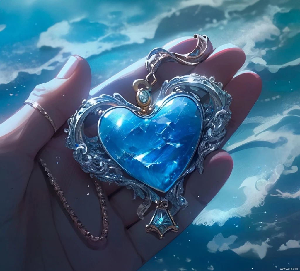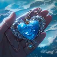 a piece of jewelry, which appears to be a heart-shaped pendant with a blue gemstone set in the center. It is intricately designed, possibly made of metal and adorned with