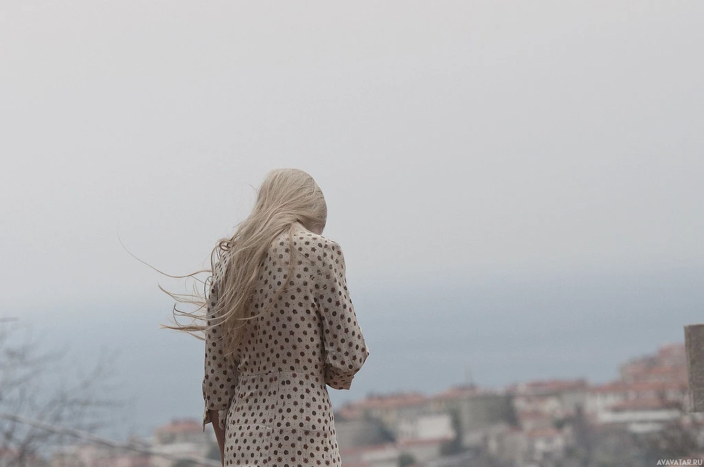 blonde hair and appears to be standing on a coastal cliff with a view of the ocean or a large body of water. The weather seems overcast, suggesting it might be
