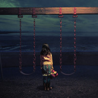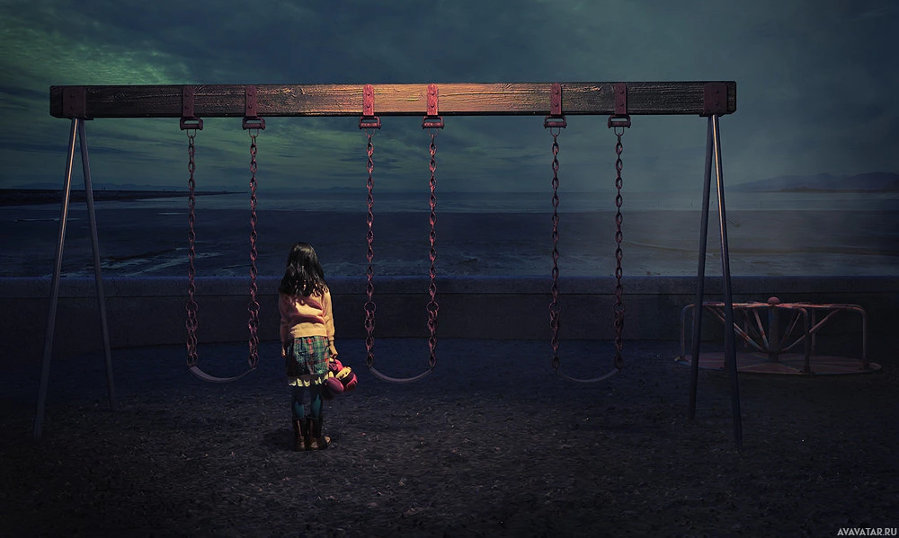the beach at night. There is a swing set in the foreground, but no children are present. The individual appears to be looking towards the water or horizon, and the atmosphere of the photo suggests it could be taken during dusk or dawn due to