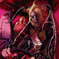 a wild expression on her face. The background has a dark, fiery theme, enhancing