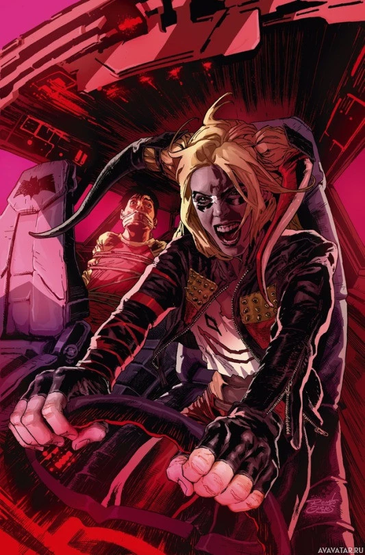 Harley Quinn, a well-known fictional character from the DC Comics universe. She is depicted as driving a car with