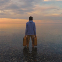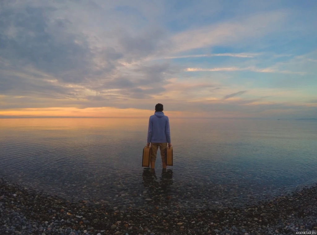 a body of water, possibly a lake or a beach. The individual appears to be looking out towards the horizon. The sky is colorful with