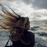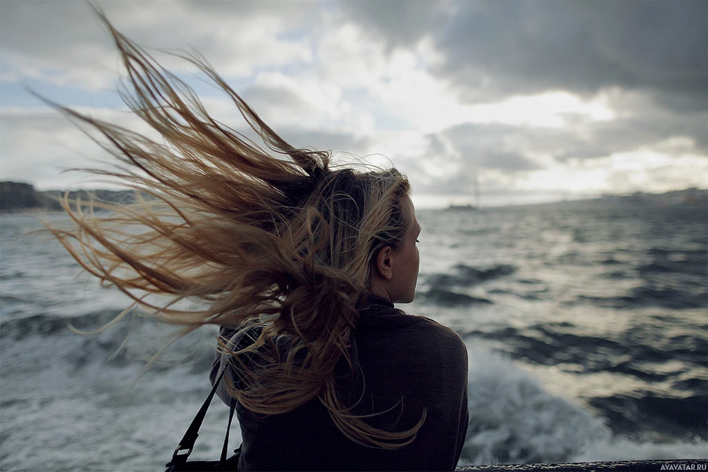 The image shows a person, specifically a girl with her hair flowing in the wind, as she looks out towards the sea from what appears to be a boat or