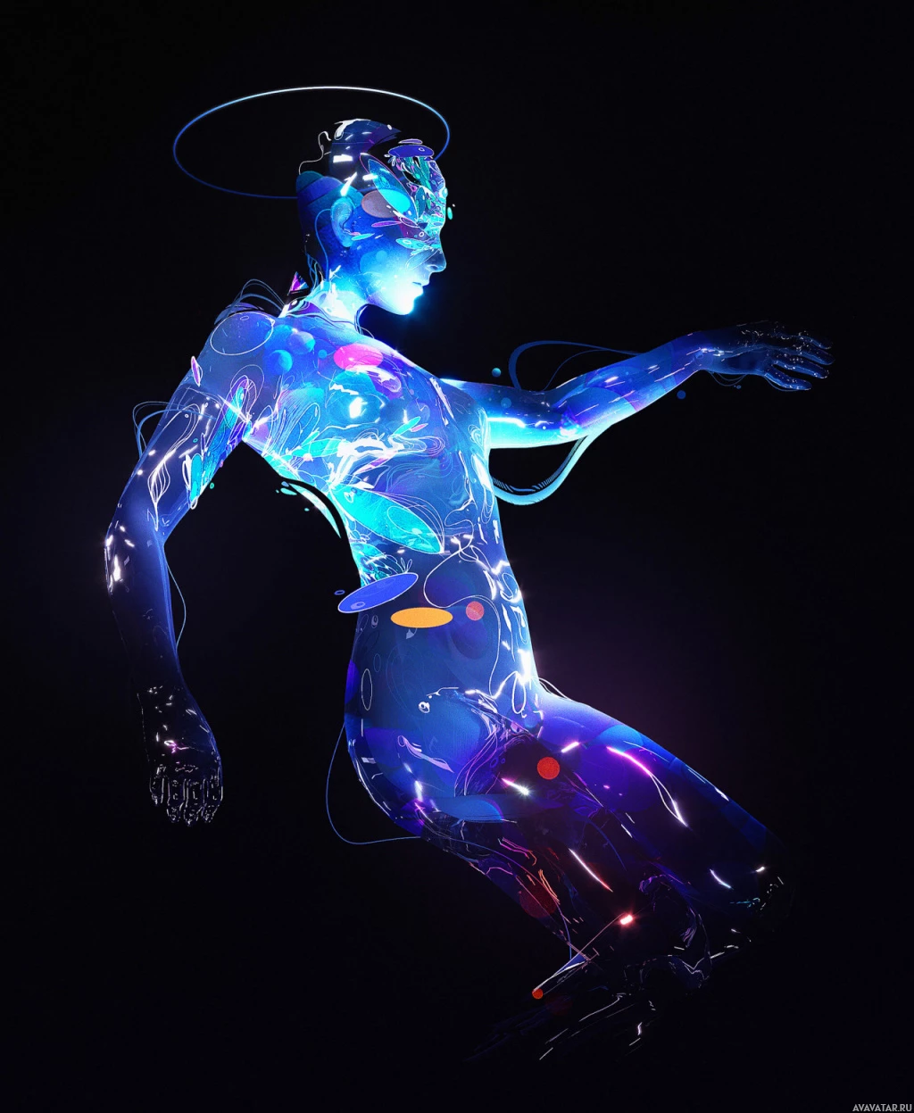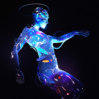 technological integration or perhaps representing the concept of cybernetics. The color scheme includes shades of blue, purple, and white, giving it a neon, futuristic appearance. The figure is set against