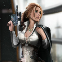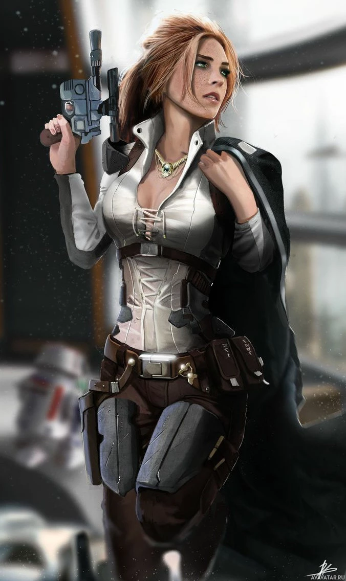 red hair and is wearing a black coat with what looks like a blaster holster on her hip. In her hands, she holds a blaster, suggesting she might be a part of an action-