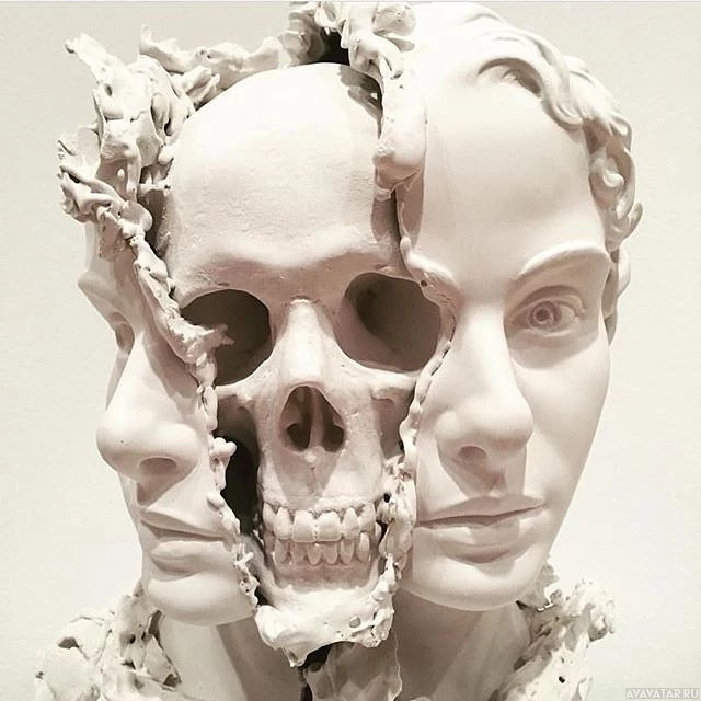 human faces with the middle one replaced by a skull. This is an artistic representation often used to symbolize themes such as mortality, death, or the interplay between life and death. The use of a realistic skull instead of a conventional portrait creates