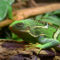a piece of wood, possibly in an indoor enclosure given the presence of artificial plants and other materials that resemble natural forest flooring. This species is known for being able to change coloration as a form of thermoregulation, which helps them adapt to their environment.