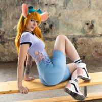 exaggerated proportions, especially their very large hands and feet. The character being cosplayed is known for their inventive skills in fixing various machines and gadgets, often wearing