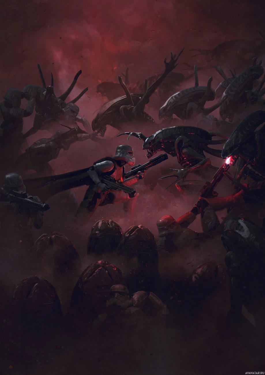 an alien creature that resembles one from the "Aliens" movie series. The background has a fiery,