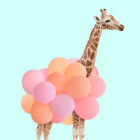 The image features a giraffe wearing a large bouquet of balloons. The giraffe is standing against a light blue background, and the balloons are in various shades of pink, peach, and cream. This is likely an artistic or whimsical depiction rather than a real-life scenario.