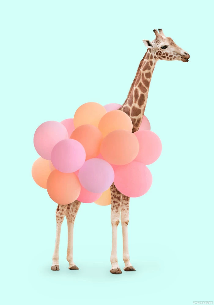 На картинке изображен жираф, одетый в большой букет воздушных шаров. Жираф стоит на светло-синем фоне, а воздушные шары находятся в различных оттенках розового, персикового и кремового. Скорее всего, это художественное или причудливое изображение, а не реальный сценарий.