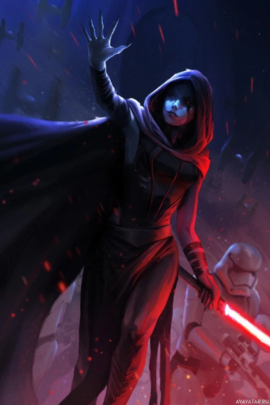 a hooded cloak, with her face obscured by a mask that has white markings around the eyes and nose. The character is wielding what looks like a lightsaber with