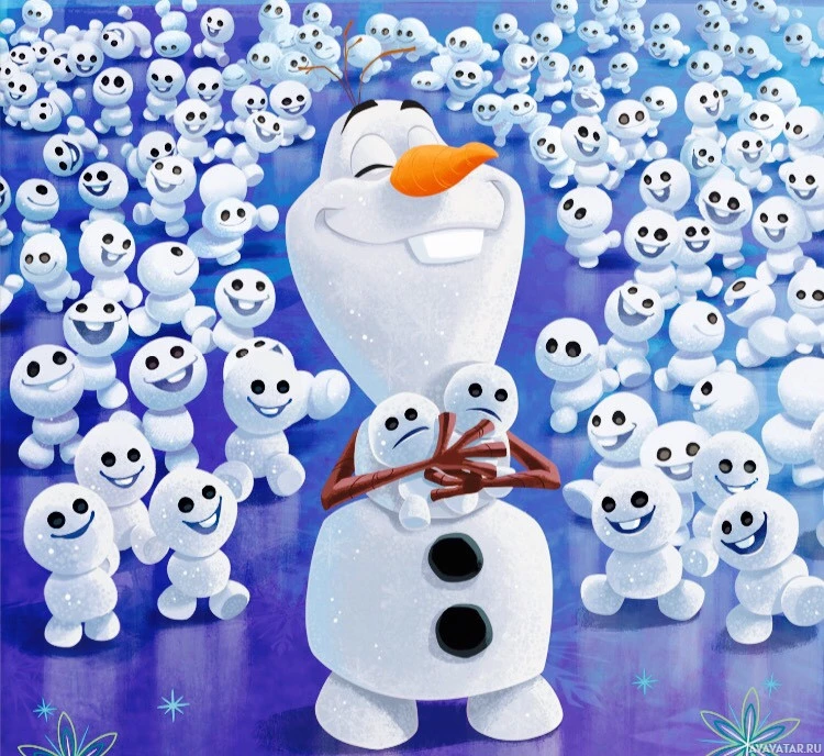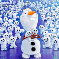 the animated character of Olaf from "Frozen" and several animated snowmen. They are all gathered together, suggesting