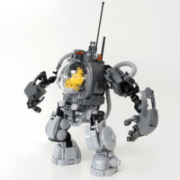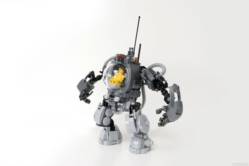 На картинке изображен робот, сделанный из кирпичей Lego. Похоже, что он разработан в стиле гуманоида, с сочлененными ногами и руками, и имеет некоторые механические детали, которые предполагают, что это может быть строительный или ремонтный робот.