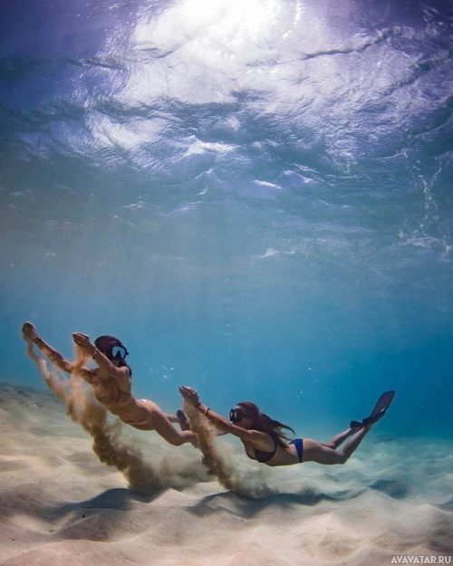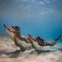 The image shows two people underwater. They are wearing swimming goggles and appear to be snorkeling, possibly in