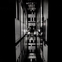 reflection of light on the walls adds depth to the scene, emphasizing the confined space.