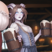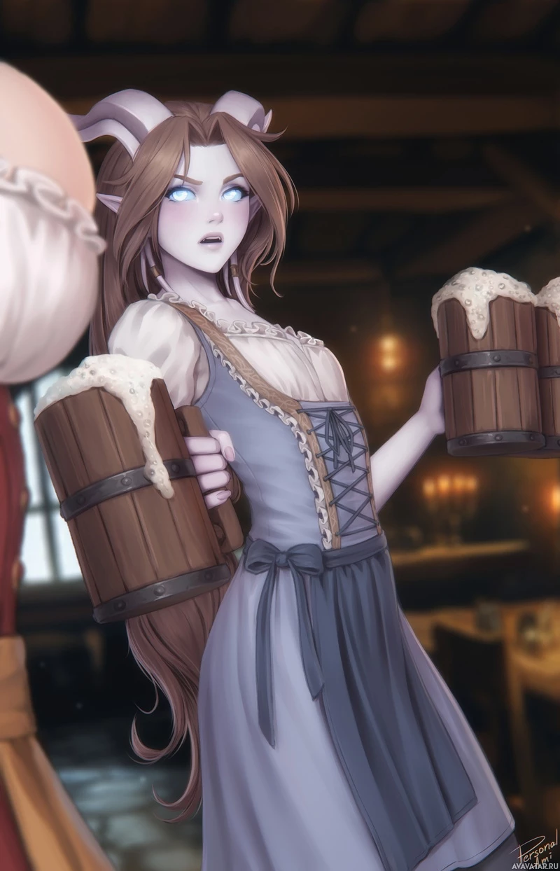 In the picture, there is a character that appears to be a fantasy-style draenei, which is a race from the "World of Warcraft" game. The character is depicted with goat-like features such as horns and ears. This character is holding