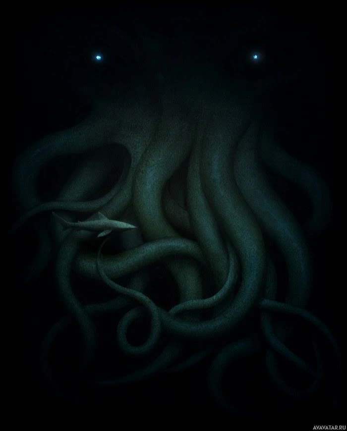a menacing manner with tentacles reaching out towards an unseen prey or victim. The monochromatic color scheme gives it a mysterious and ominous atmosphere.