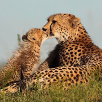 the baby cheetah, which appears to be a form of affectionate behavior often seen among animals to strengthen bonds between mothers and their offspring. This image captures