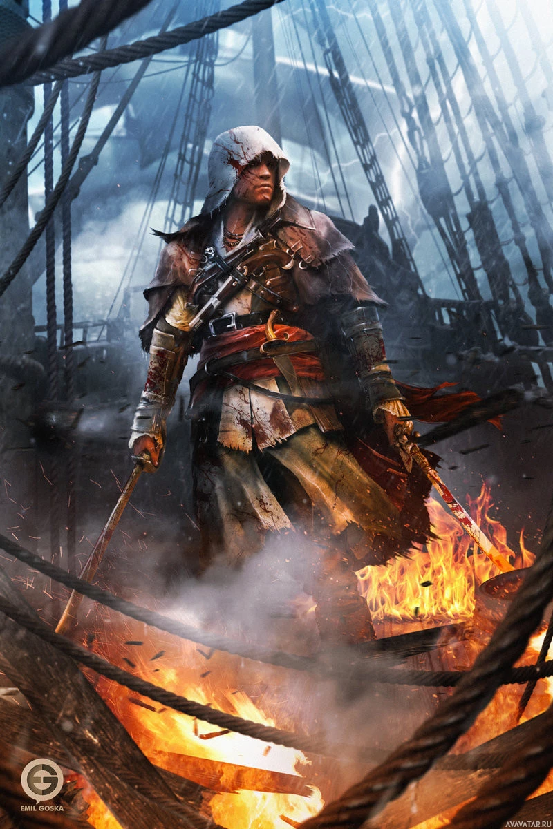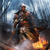 the video game "Assassin's Creed," featuring a character in an action pose with a shipwreck or battlefield in the background, suggesting a theme of conflict and adventure. The character is equipped with weapons and armor typical of the game's
