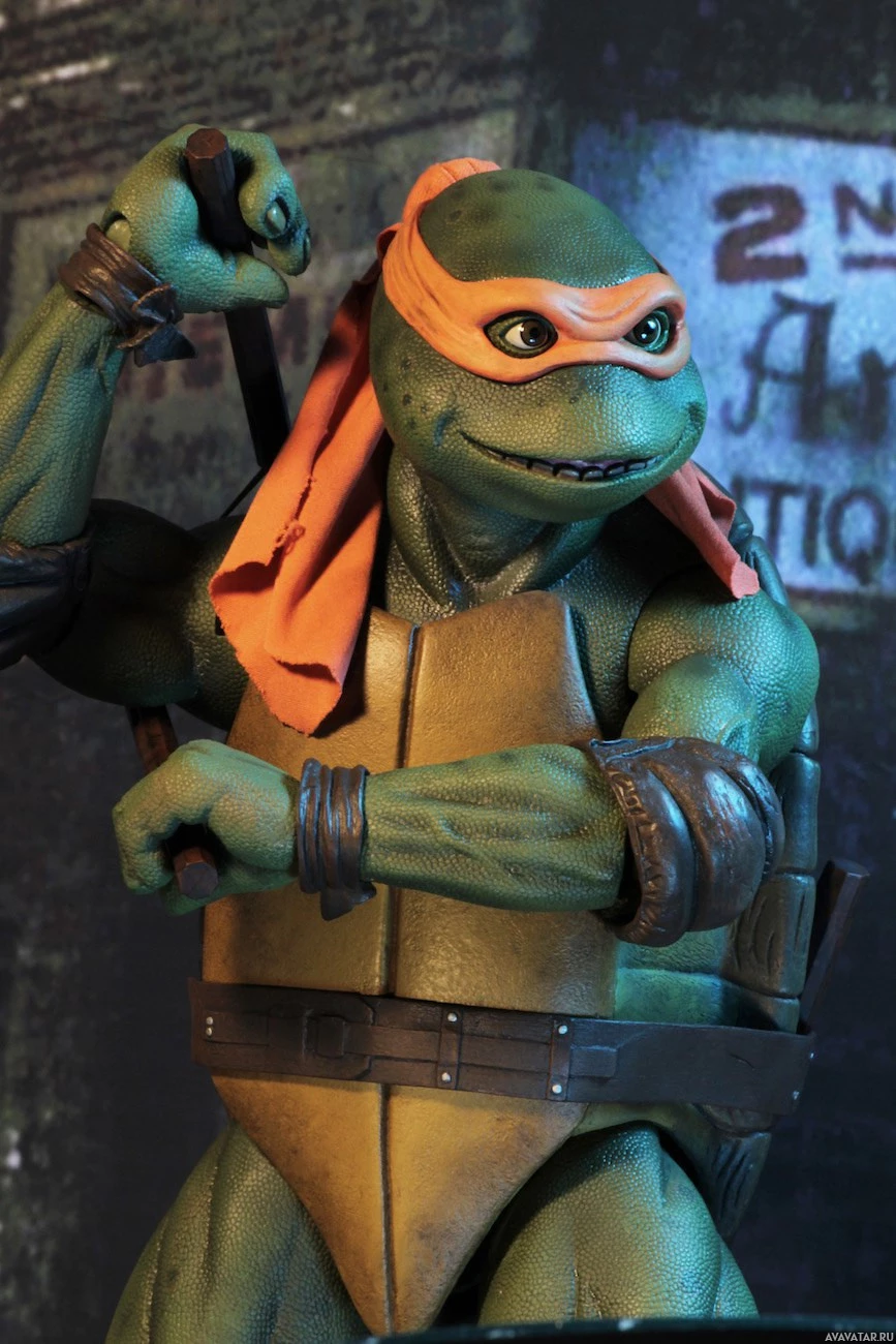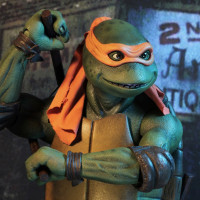 The image features a figure of Michelangelo from the Teenage