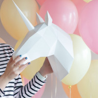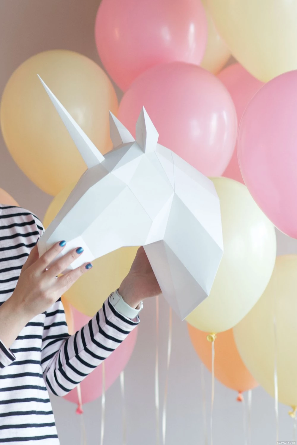 The picture shows a person holding up a hand and displaying a unicorn balloon. Behind the individual, there are several colorful party balloons of different sizes scattered across the background.