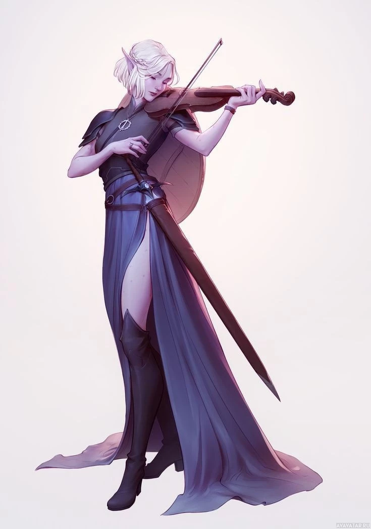 white hair and closed eyes. She is playing a violin while wearing armor that includes a cape or skirt. It's a digital artwork that combines elements of music and armor, creating an ethereal and majestic atmosphere.