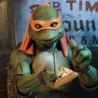 The image features a toy or figurine of Michelangelo, one of the Teenage Mutant Ninja Turtles. He is holding a slice of pizza, which is a signature item associated with this character due to his love for pizza as depicted in the animated series and movies.