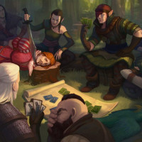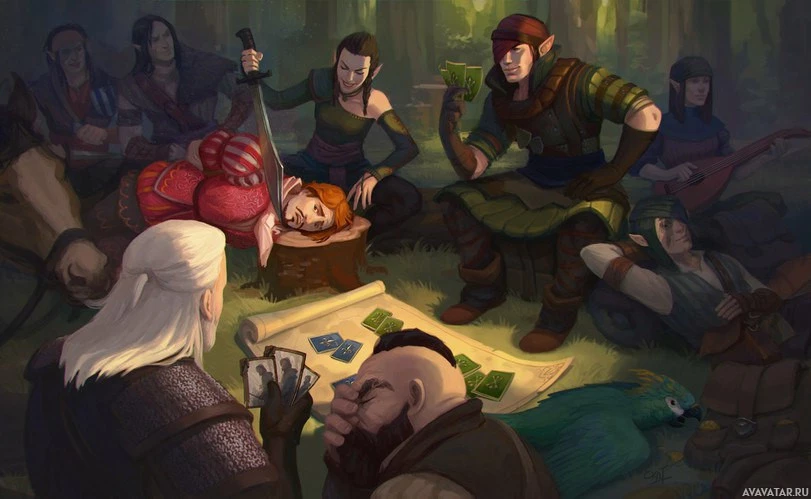 a black outfit with a scarf, a third in light-colored robes, and a fourth dressed in dark clothing. They seem to be seated on the ground around an area where cards or some form of game are being played. The setting appears to be an outdoor clearing within a forest. The characters are known for their roles in the story, each with unique costumes and abilities that reflect their