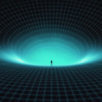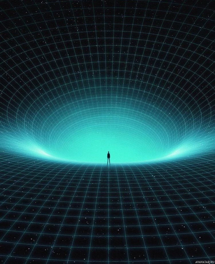 The image shows a silhouette of a person standing at the edge of an open, spherical space with