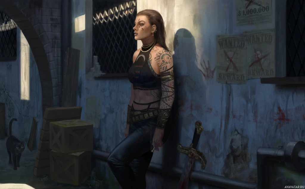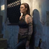 dilapidated building or cellar. The individual has a tattoo on their arm and is wearing leather attire with metal details that could suggest a fantasy or