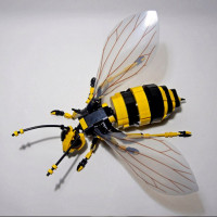 mechanical bee has articulated wings that can flap like those on a living bee, indicating it may have motors inside to enable flight or movement. The robot is displayed against