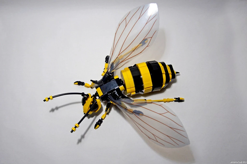 a Lego robot. The bee has yellow and black coloring, which resembles the colors of some real-life bees such as the Yellowjacket. This