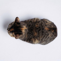 На снимке изображена кошка, лежащая. Похоже, это котенок, учитывая его размер и особенности. Фон белый, что выделяет кошку в качестве основного объекта изображения.