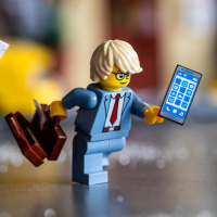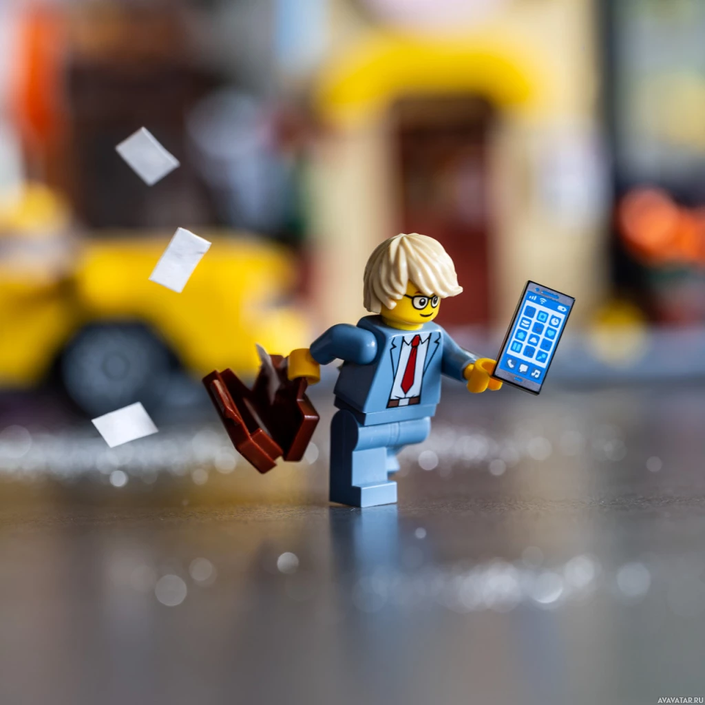 Lego figure is holding a smartphone and seems to be checking the time or viewing something on the screen.