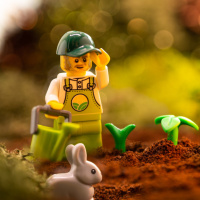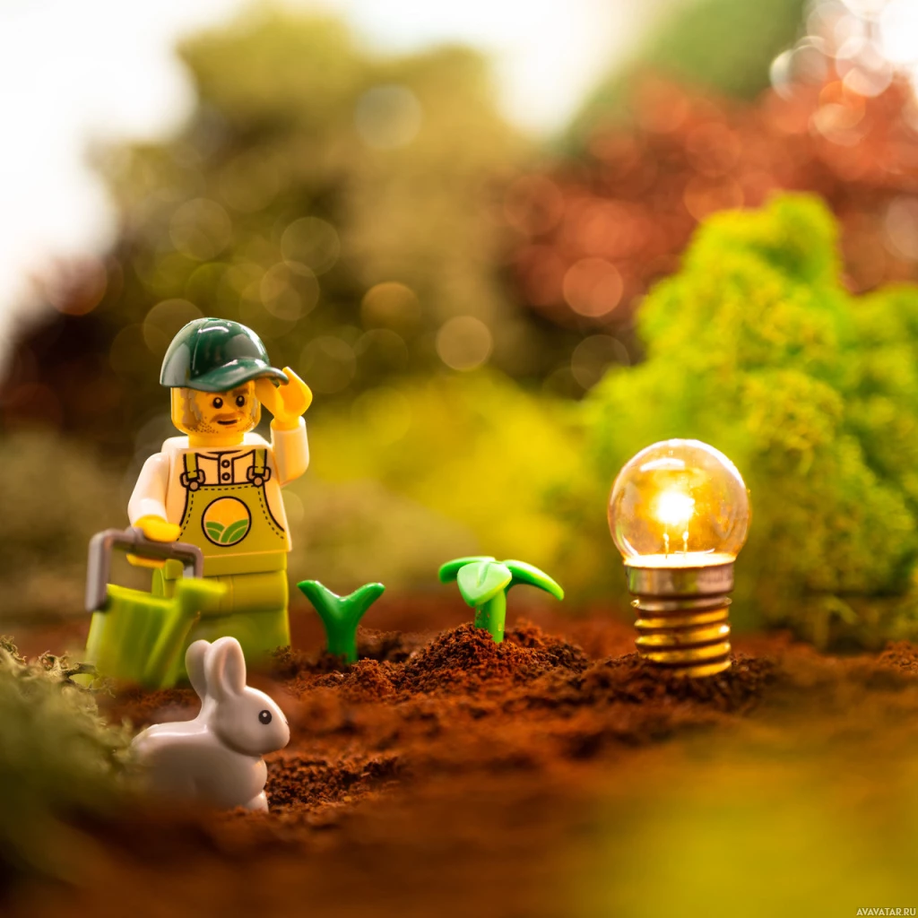 an Lego minifigure dressed as a worker or gardener, wearing a hard hat and holding a watering can. Beside the minifigure is a glowing lightbulb with