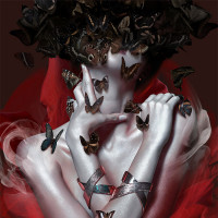 the head area, as if holding or manipulating something not visible in the frame. The style of the image is artistic and could be interpreted as