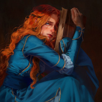 На картинке изображен иллюстрированный персонаж, который выглядит как молодая девушка с рыжими волосами. Она носит синий наряд, который, кажется, вдохновлен фэнтези или историческими костюмами, и она держит в руке то, что выглядит как маленькая книга. Ее выражение предполагает печаль или созерцание, когда она смотрит вниз. Стиль работы кажется подробным и вызывает чувство меланхолии или самоанализа.
