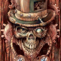 a top hat, which is often associated with characters like the Mad Hatter from Alice in Wonderland. The skull has mechanical or industrial elements incorporated into its design, such as gears and pipes, giving it a steampunk appearance. There are also smaller details that resemble eyes and mouthparts on the skull, adding to