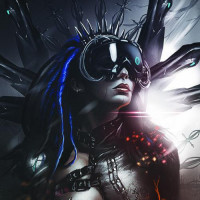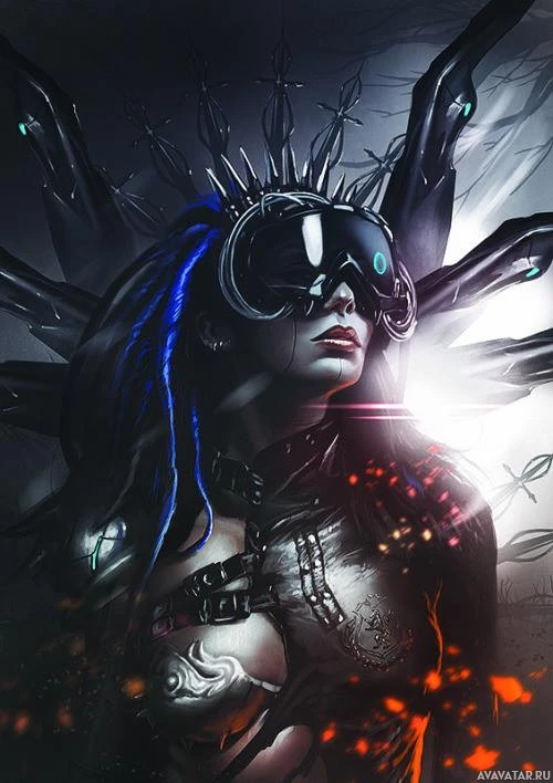 mechanical components on her head and torso. She is wearing a helmet with a visor that obscures the eyes, giving her an intimidating or mysterious appearance. The background suggests a dark, industrial environment, which could be a space station or some kind of