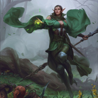 magical energy in their right hand, suggesting they may possess some form of magic or enchantment. In the background, there are other characters that seem to be under the influence of the elf's spell, with one lying on the ground and another standing behind with