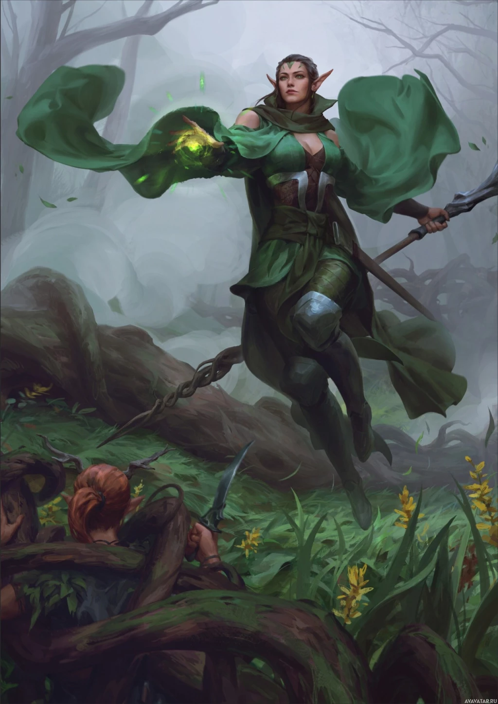 a fantasy scene featuring an elf. The elf, characterized by pointed ears and green clothing, is standing in a misty