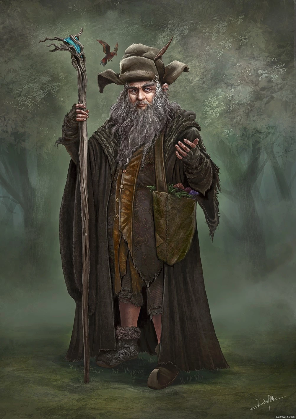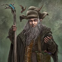 The image depicts a character who appears to be Radagast the Wise, from J.R.R. Tolkien's Middle-earth series, particularly from "The Hobbit." He is portrayed with