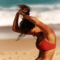 На фотографии изображена женщина, сидящая на пляже. Похоже, она наслаждается своим временем у океана, возможно, после купания или игры в волнах. Ее язык тела говорит о том, что она расслаблена и довольна.