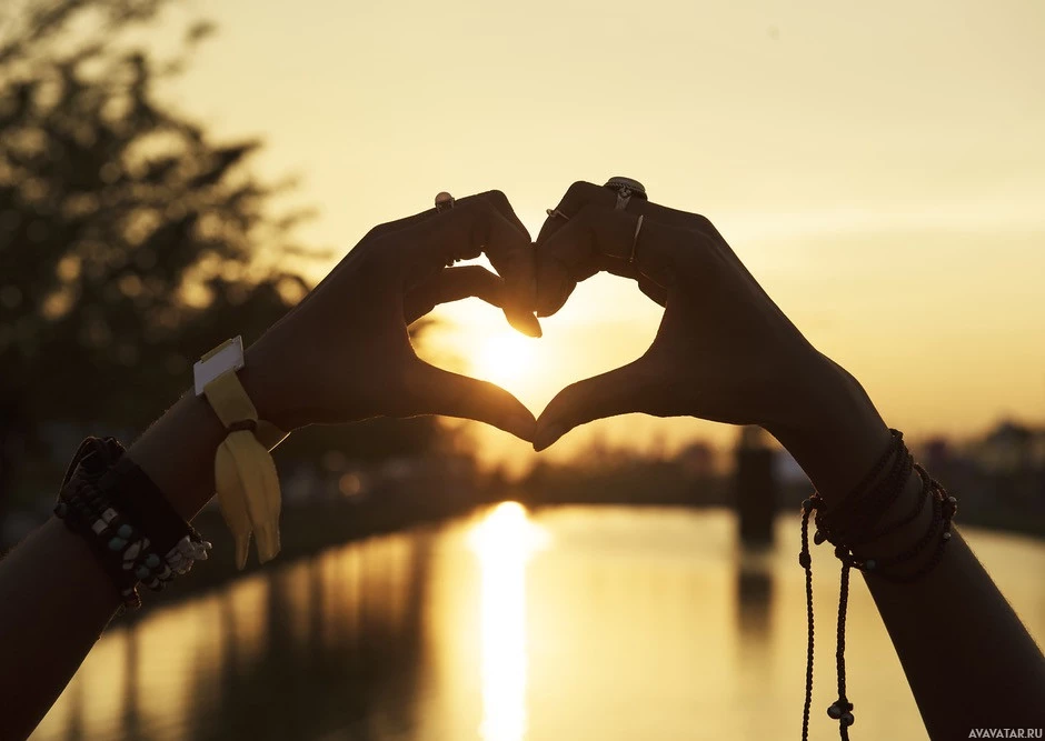 На картинке изображены две руки на фоне заката золотого часа. Каждая рука создает форму сердца пальцами, символизируя любовь или привязанность. Освещение предполагает, что это либо раннее утро, либо поздний вечер, что добавляет безмятежной атмосфере сцены. Теплые цвета от заходящего солнца придают изображению мирное и романтическое ощущение.