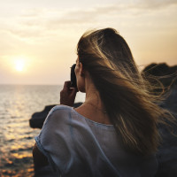 The image depicts a person standing on what appears to be a coastline, looking out towards the ocean. The sun is setting or has just set, as indicated by the warm and soft lighting that suggests either dawn or dusk. The person seems relaxed and contemplative, possibly enjoying