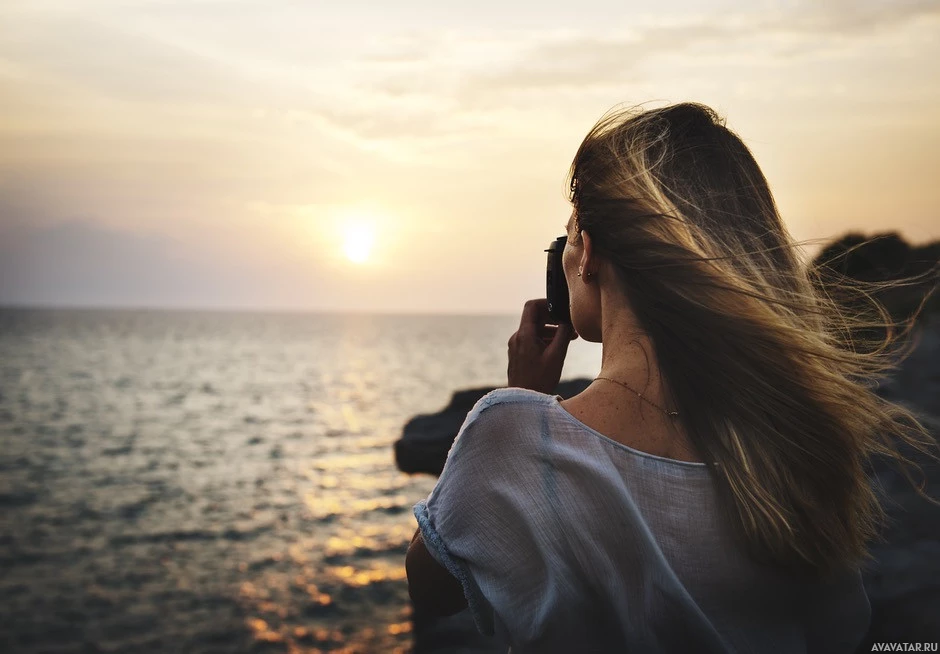 the tranquility of the scene. Their hair is blown by what might be a gentle