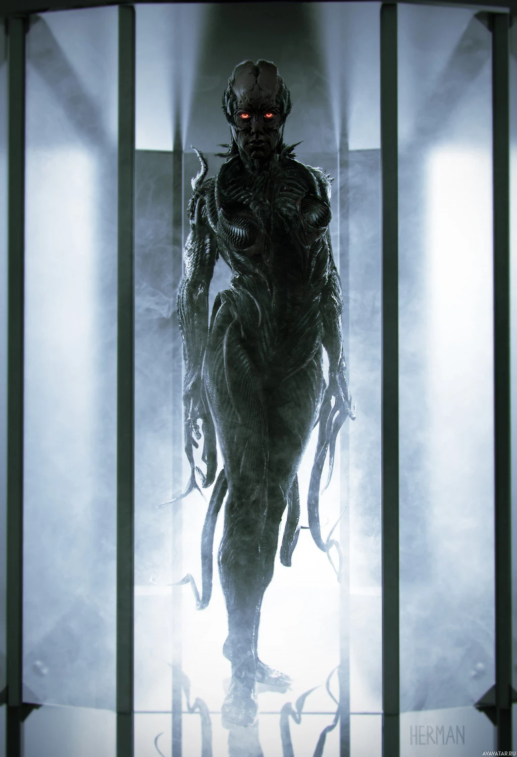 red eyes, and various attachments that resemble mechanical appendages. The figure is standing inside what appears to be a futuristic environment with a transparent enclosure or pod, which suggests the setting might be related to