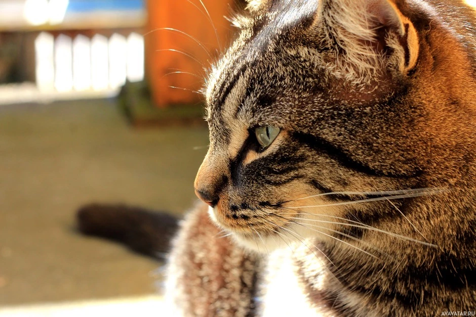 green eyes and is looking off to the side with a somewhat contemplative expression. The cat is sitting outdoors in what seems like a brightly